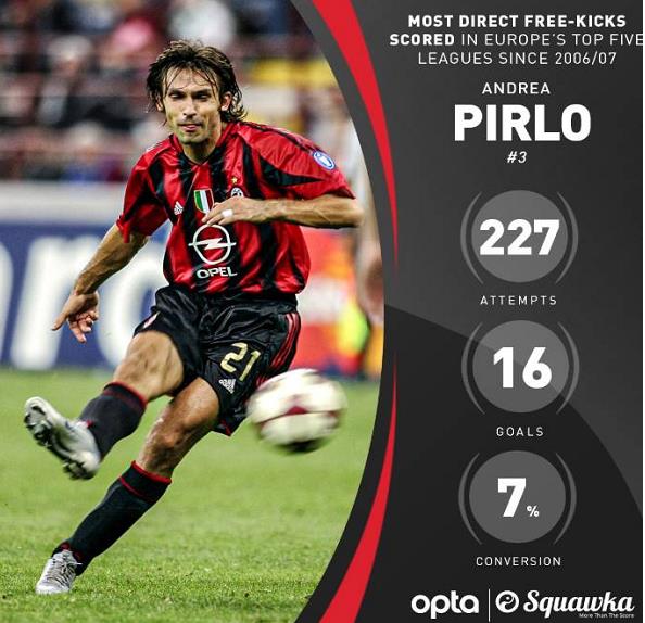 说完梅西和C罗,再说说其他球员,梅西和C罗以外任意球进球数量最多的是皮尔洛,他227次射门,打进16球,进球率7%,第四的是阿朗戈,他193次射门打进16球,进球率8.3%,第五的是皮亚尼奇,他180次射门打进16球,进球率8.9%。可以说这三人是梅西和C罗以外,任意球最好的球员。
