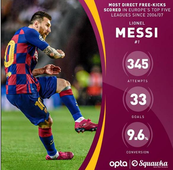 近日,OPTA给出的数据,从06-07赛季至今,梅西是足坛中任意球进球数量最多的球员,他一共主罚了345次任意球,其中他打进了33球,任意球进球率高达9.6%,可以说梅西是足坛现役真正的任意球王。梅西是第一,肯定很多人好奇C罗的进球数是第几呢?