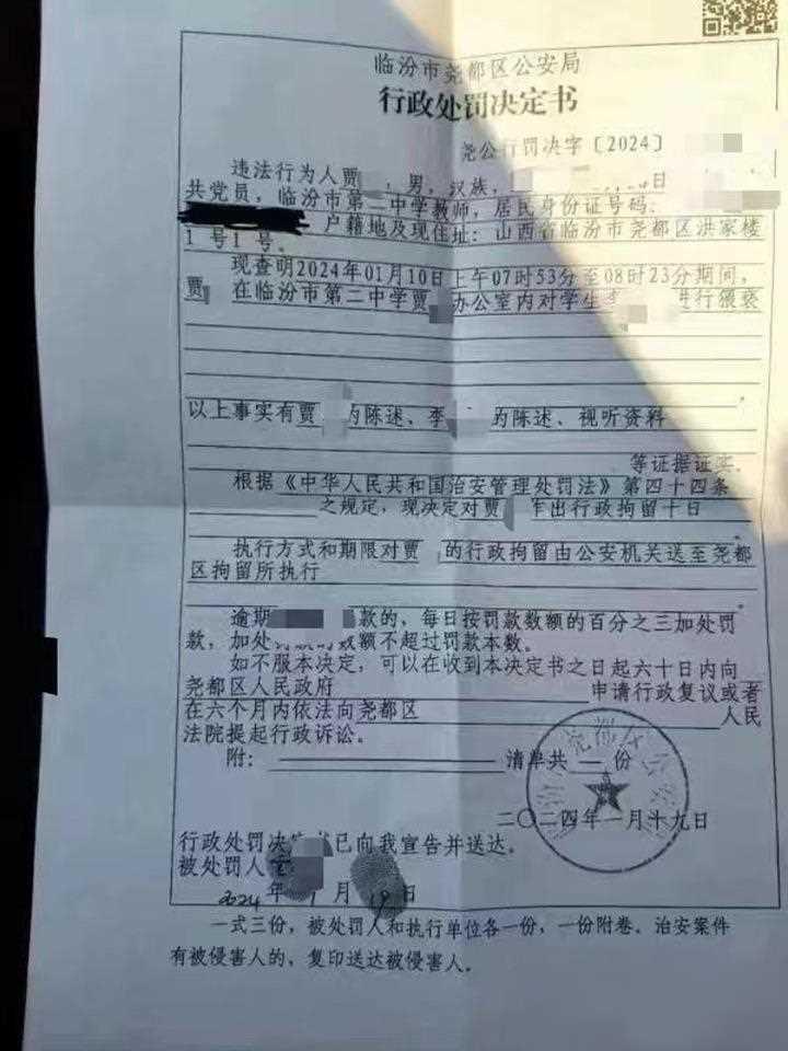 山西临汾一中学教师涉嫌猥亵男学生:教育局行政拘留10日