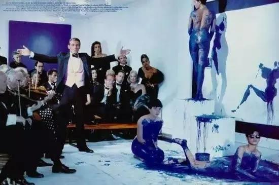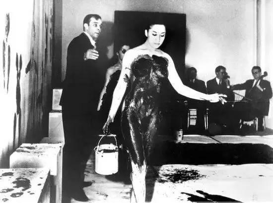 举办了给他带来争议《蓝色时代的人体测量》,现场九位音乐家演奏 《单调交响曲》,这是画家为了这场show“特制”的曲子,三个美丽的裸体模特儿变成了 “活画笔”,在克莱因的指挥下,她们用涂满了颜料的身体,在地面和墙上的画布上翻滚按压,直至画布上的图案变成画家满意的“杰作”。