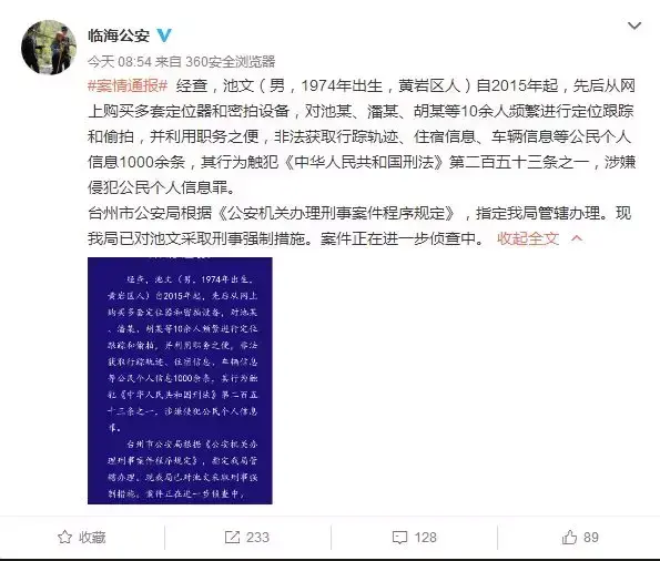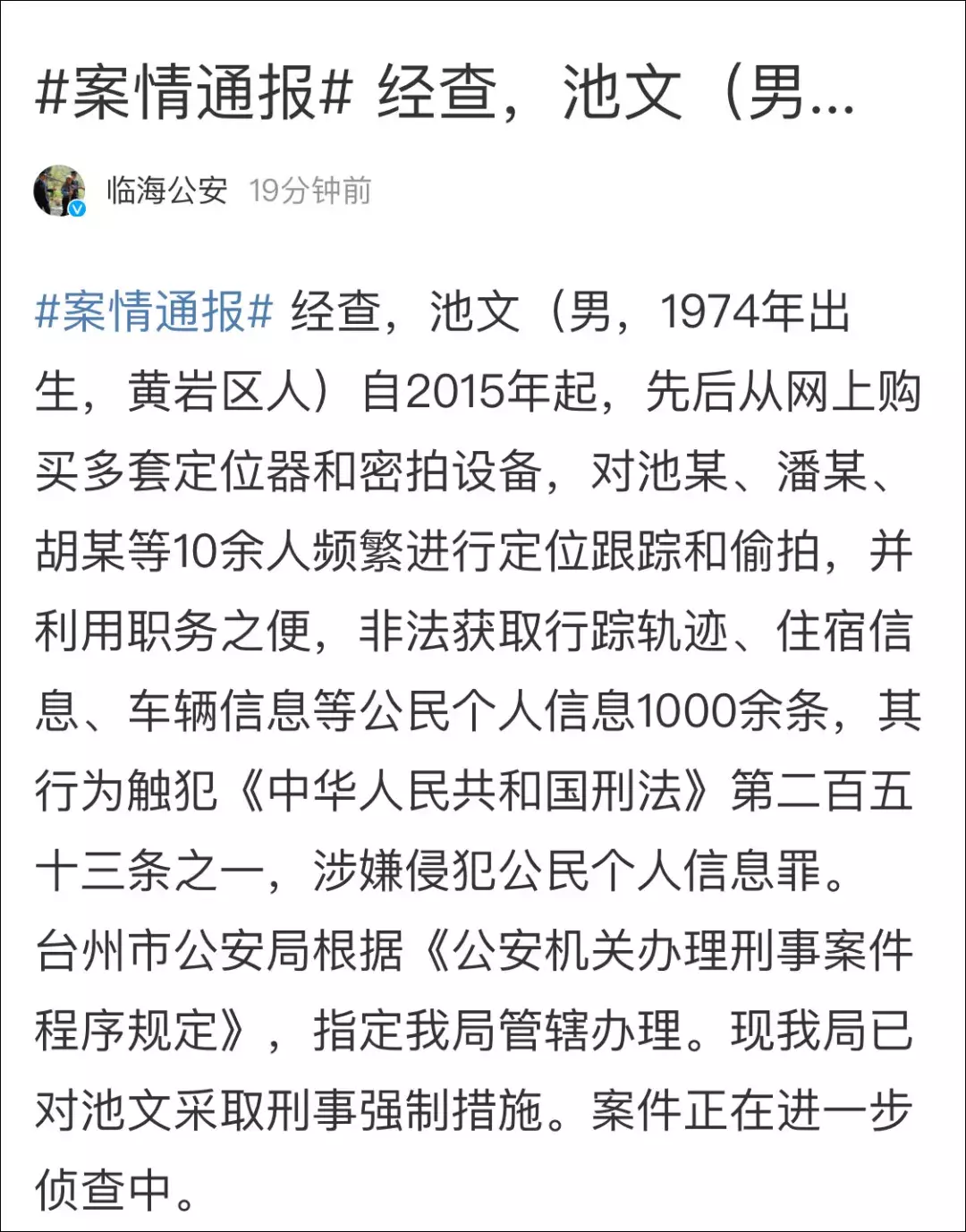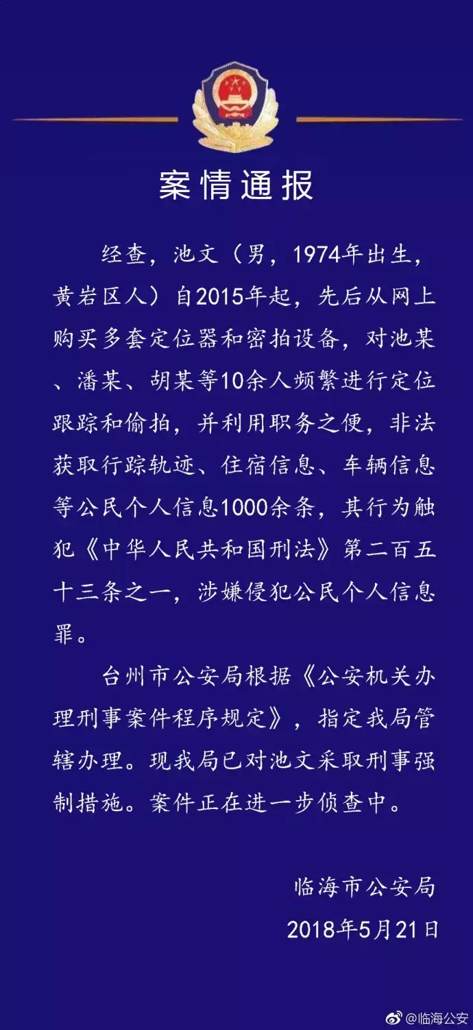 同样是今天早上,@临海公安 官方微博通报称,原民警池文利用职务之便,定位跟踪、偷拍10余人,非法获取个人信息,涉嫌侵犯公民个人信息罪,公安机关对其采取强制刑事措施。