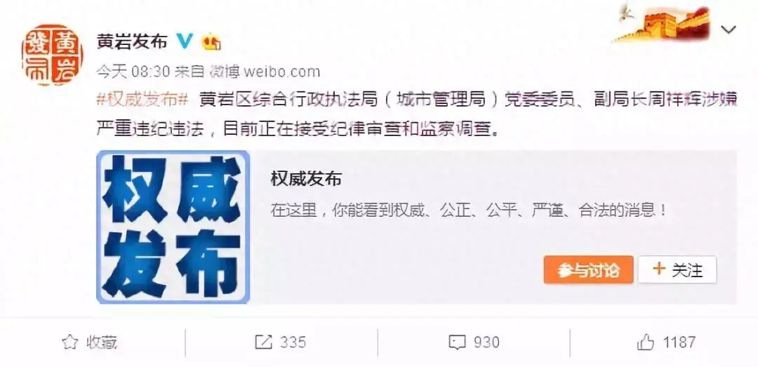 @黄岩发布 官方微博通报称,黄岩区综合行政执法局(城市管理局)党委委员、副局长周祥辉涉嫌严重违纪违法,目前正在接受纪律审查和监察调查。
