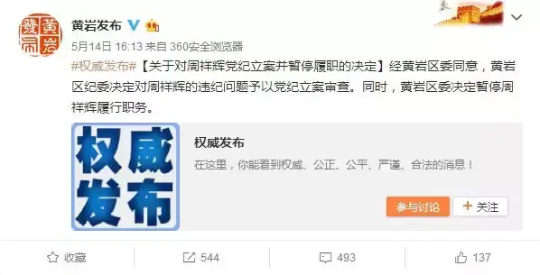 今天早上,微博@黄岩发布 通报称,周祥辉因涉嫌严重违纪违法,正接受纪律审查和监察调查调查。