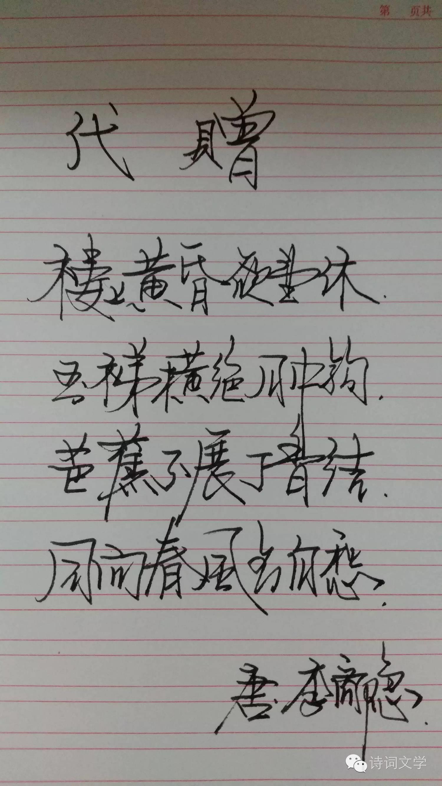 这首诗写思妇之离愁,是作者以女子的口吻写与情人离别的愁思,这首诗写离愁,写得风华流美,情致宛转。不但写女主人公无心凭栏远眺,而且连眼前的芭蕉和丁香都含愁不解,愈添感伤。代赠,即代拟的赠人之作。