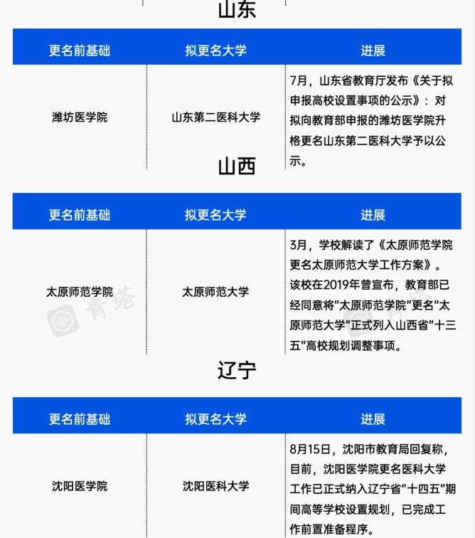 湖北、宁夏、甘肃、海南、云南、吉林、山东、山西和辽宁省内,都是分别有1所院校拟更名,都是当地官方重点支持的。