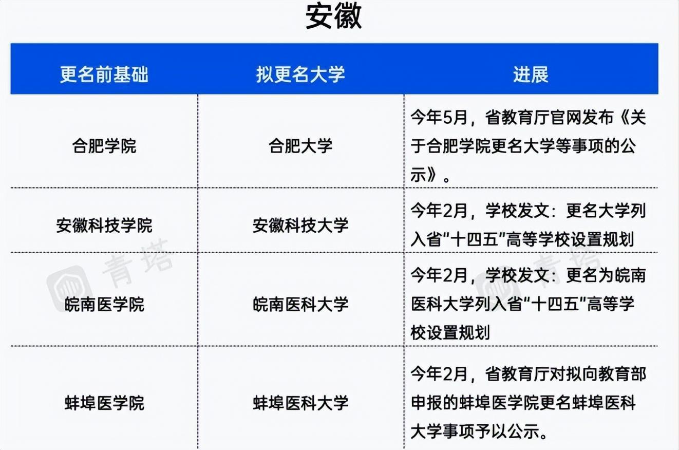 安徽市4所院校拟更名,合肥学院拟更名为合肥大学,安徽科技学院拟更名为安徽科技大学,皖南医学院拟更名为皖南医科大学。