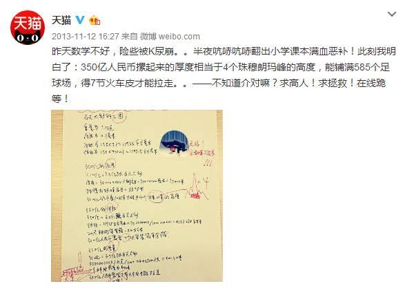2013 年的“双十一”活动中,天猫微博中有这么一条: 卖出了200万条内裤,加起来有3000公里长。之后这组数据被地方公安局官微抓住把柄: 两个数据相除发现一条内裤将近有1. 5 米长。这条微博当日转发近 8 万次,马云及其旗下的天猫便成为当日微博上最大的笑柄。天猫随后的道歉与解释并没有得到公众的谅解,反而被视为“狡辩”。