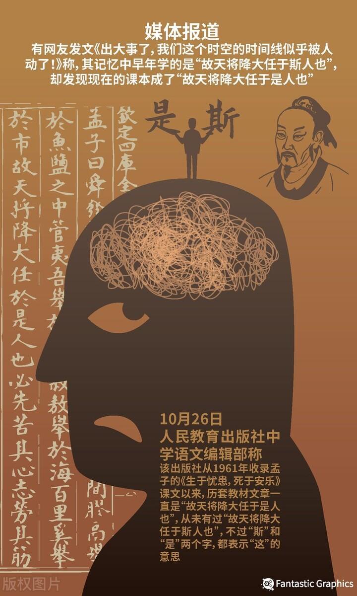最近有网友反映我们的教材搞错了,中学语文课文里所学的孟子《生于忧患,死于安乐》那篇文章,应该是故天将降大任于斯人也,必先苦其心志,劳其筋骨,饿其体肤。可是教材里却出错了,写成了故天将降大任于是人也。