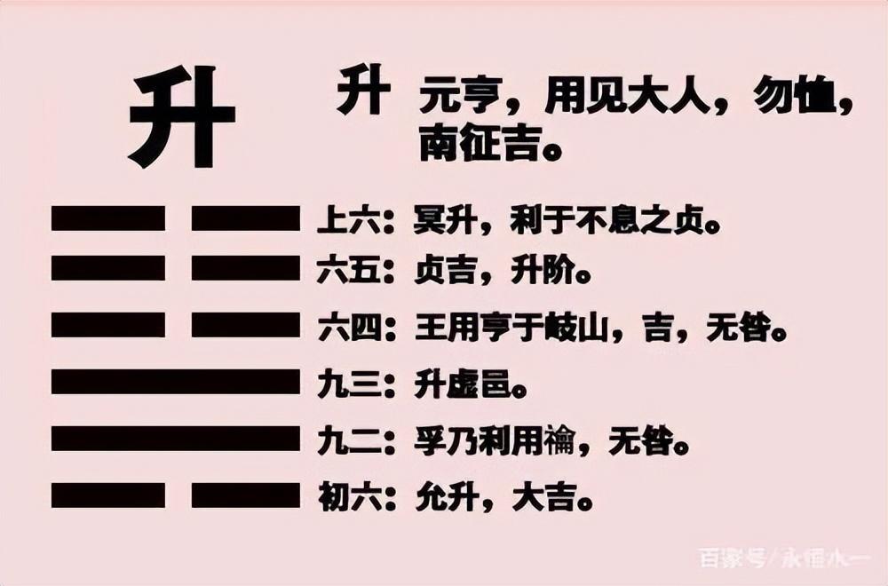 卦辞为:升,元亨,用见大人,勿恤;南征吉。