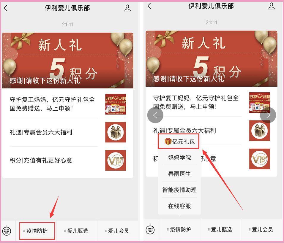 搜索“伊利爱儿俱乐部”并关注;点击左下方“疫情防护”→“亿元礼包”