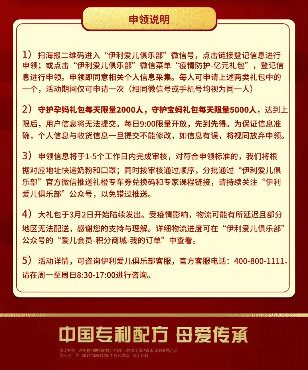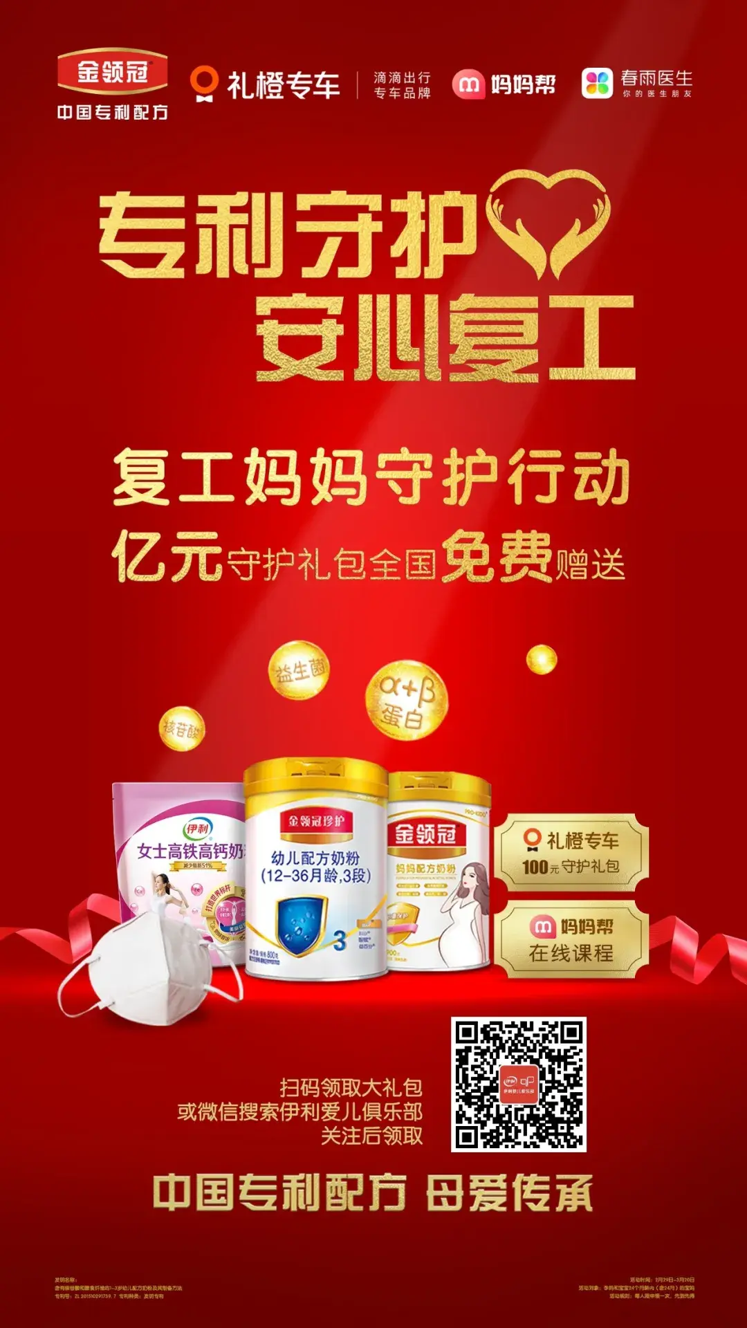 免费赠送活动,2月29日至3月20日期间,伊利金领冠将通过“伊利爱儿俱乐部”微信公众号,向全国孕产妇及新手妈妈群体免费派赠价值亿元的“复工妈妈亿起守护”大礼包。
