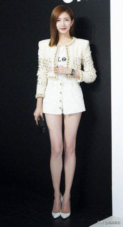 在活动现场的穿搭就比较正式了,一套白色的穿搭,上身是小香风的短款外套,下边是带扣的白色超短裤,原本修长的身材被简单又利落的剪裁设计衬得更加纤瘦,一双腿又细又直,看起来加分不少。