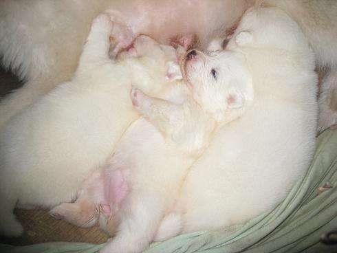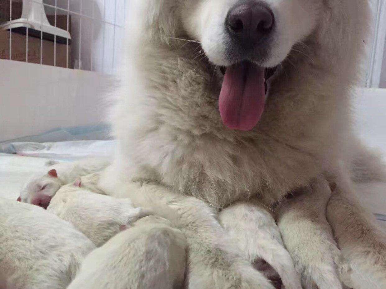 幼犬刚刚生下来,特别是像萨摩耶体表纯白都是一个模样,建议可以给它们系上不同颜色的绳子来区别。三周之内的幼犬一般只会吃母乳,母犬会自己带孩子,清理幼犬,所以一般不用特别担心饲养的问题。