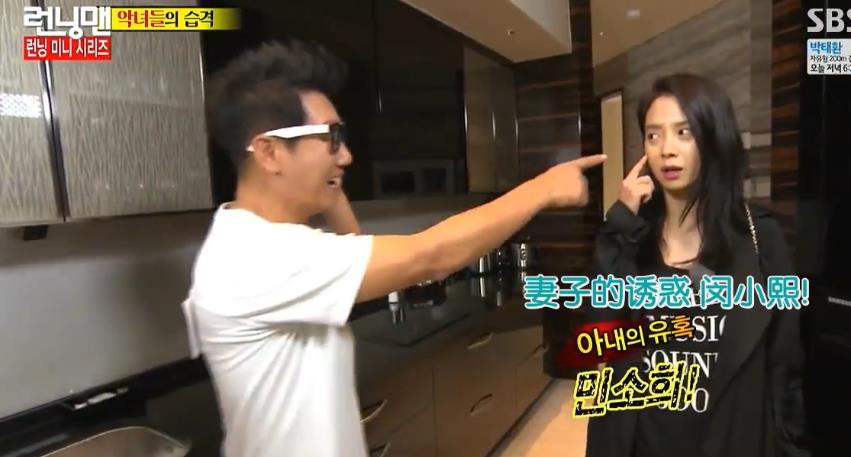 最后再看看我们的两父女,宋智孝演的是妻子的诱惑,脸上点了一颗痣化身为懵小熙,鼻叔一看也来了兴趣,开始无法控制自己的角色表演。