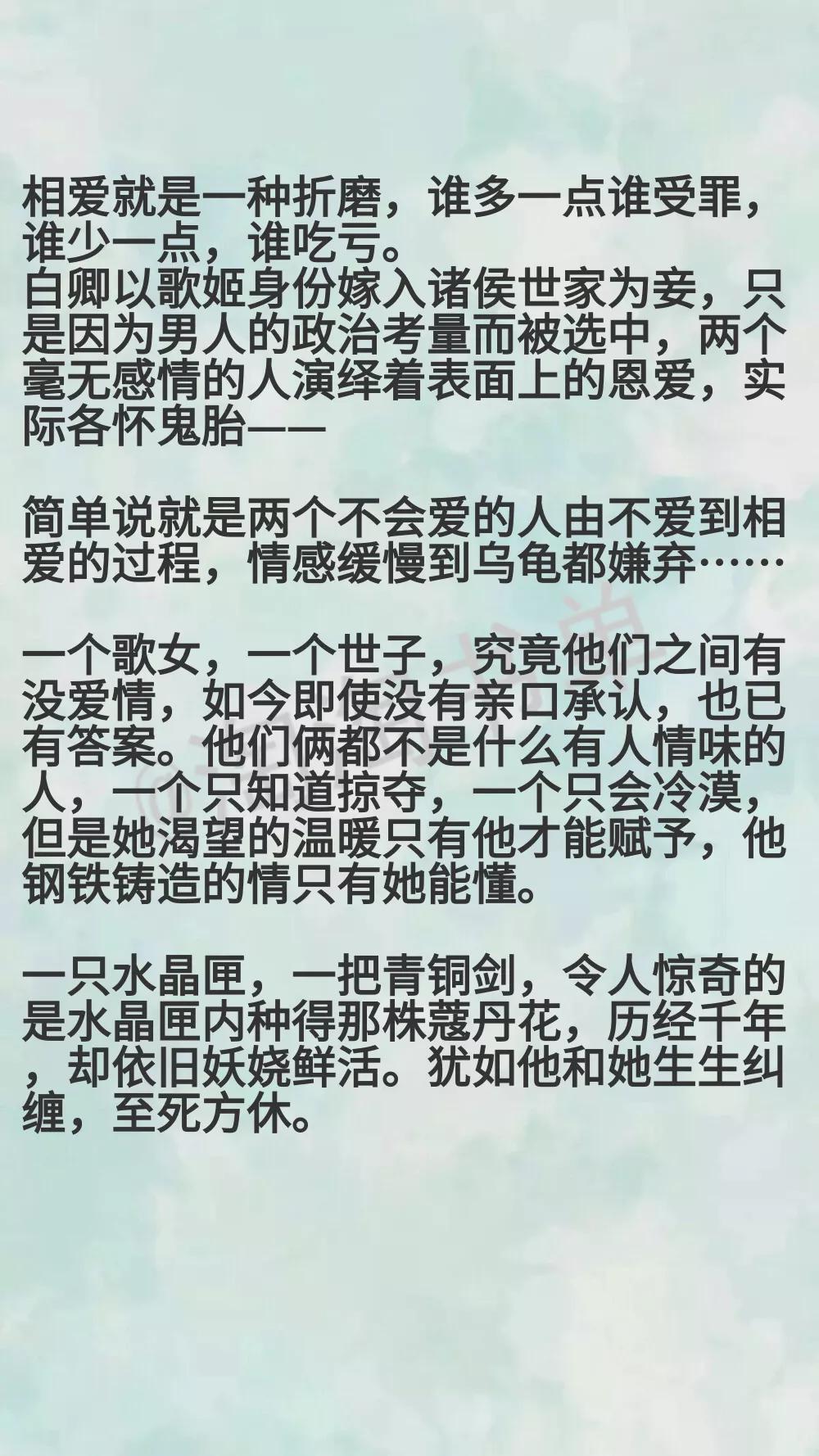 这本真是越看后面,越伤感,女主一生是得到了男主的爱和珍惜,把最心爱的人藏起来,可是被藏起来的人却是要一年一年无尽的等待……结局是某种意义上幸福的HE吧