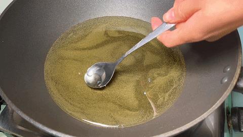 7. 起锅烧油,烧至4成热,把勺子在油里浸一下,下入一个丸子面糊试试温度