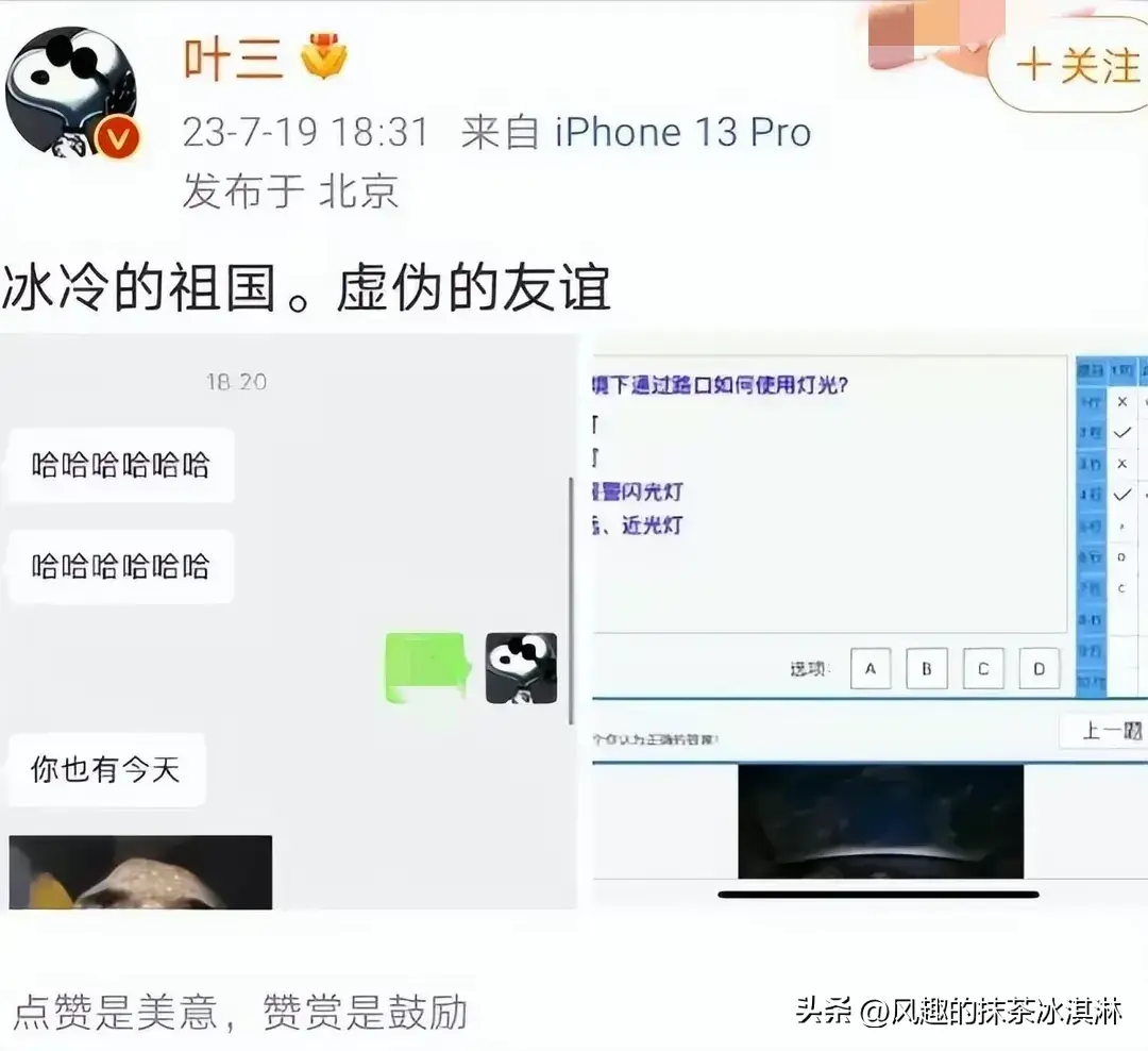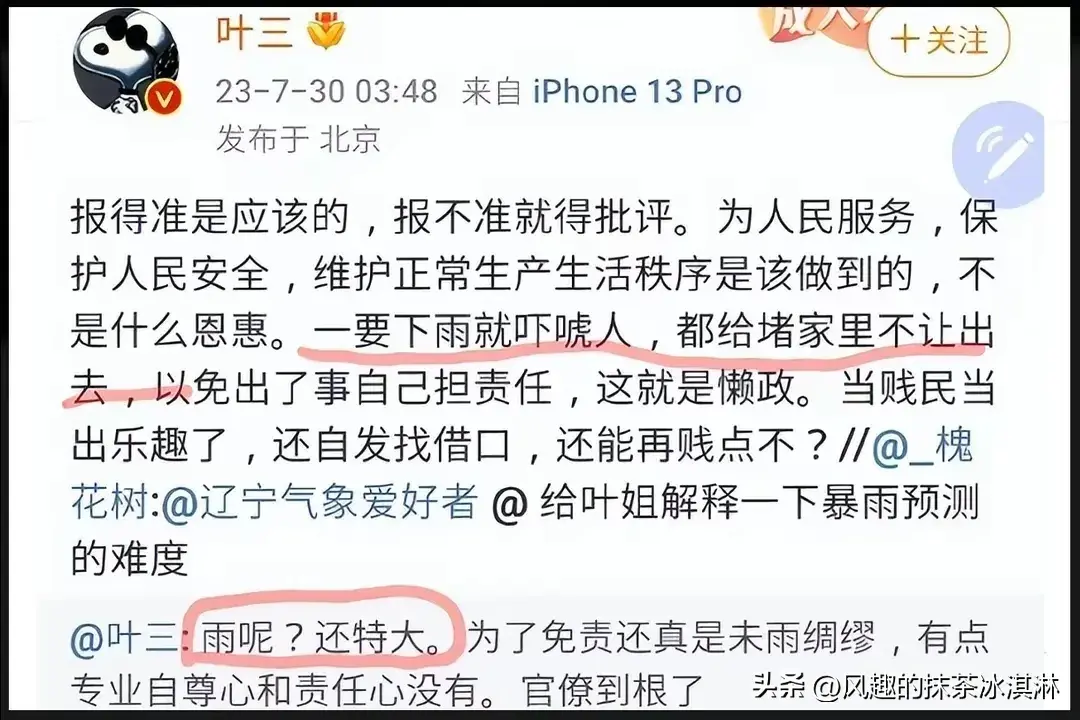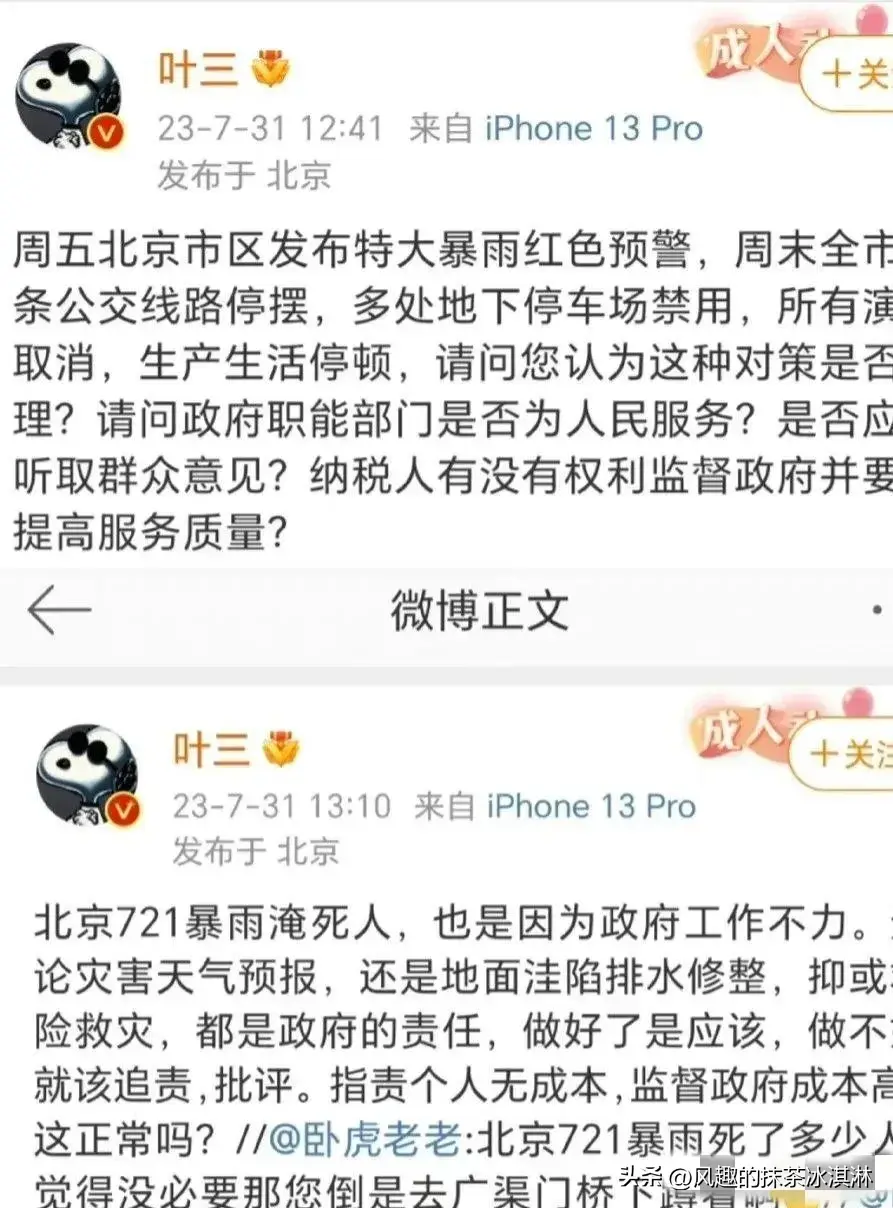 而叶三之所以冲上热搜是因为她的在微博上的发言,文中的她质疑北京政府的工作能力,她认为北京暴雨淹死人应该归咎于北京政府,从天气到路面低洼现象全部都指责一遍,称这些都是政府应该做的,做得好是本分做不好就该追责。