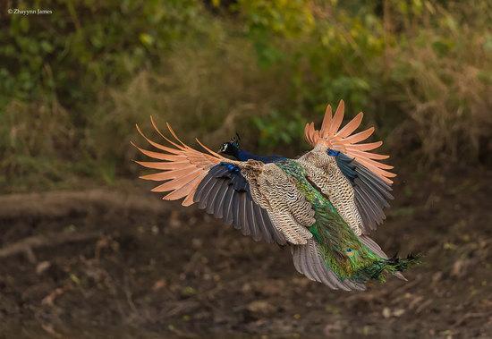 孔雀的飞行,其实是在滑翔,它们并不会进行扑翼,只是张开双翼乘着空气滑行一段距离。