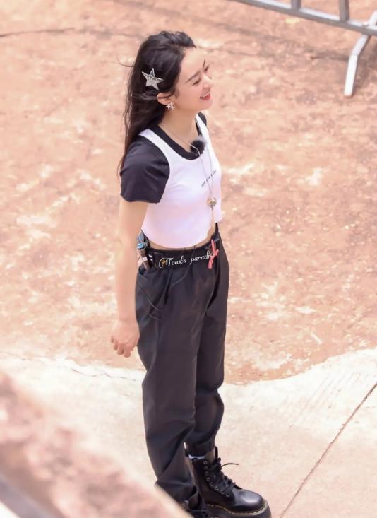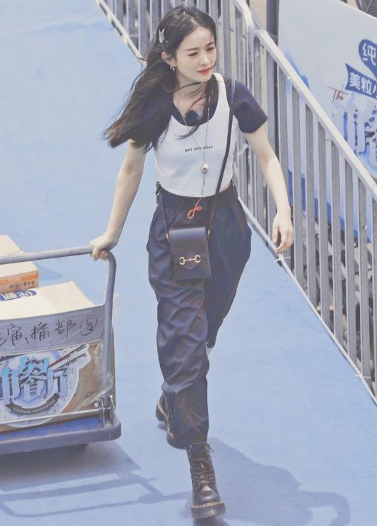 另外一张照片中的颖宝,拖着一个运货推车在烈日下行走,眉头紧蹙,看上去有些疲惫,应该是录制节目有点累了。