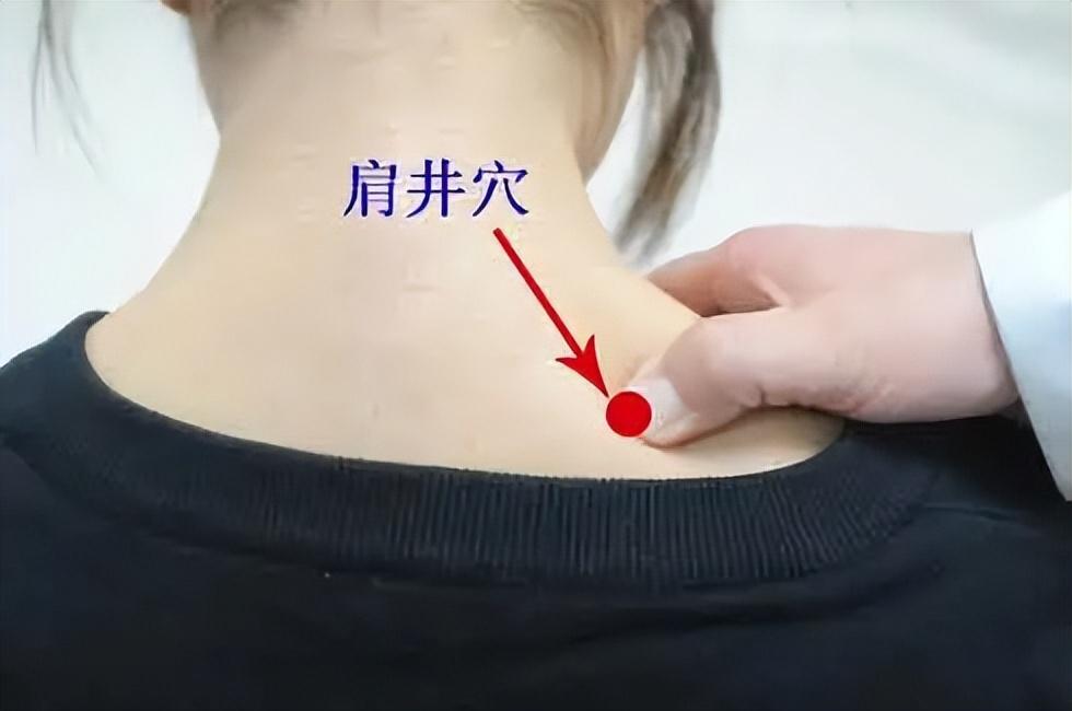 按揉肩井穴时先以左手食指压于中指上,按揉右侧肩井穴五分钟,再以右手按揉左侧肩井穴五分钟,力量要均匀,以穴位局部出现酸胀感为佳。每日早晚各一次。