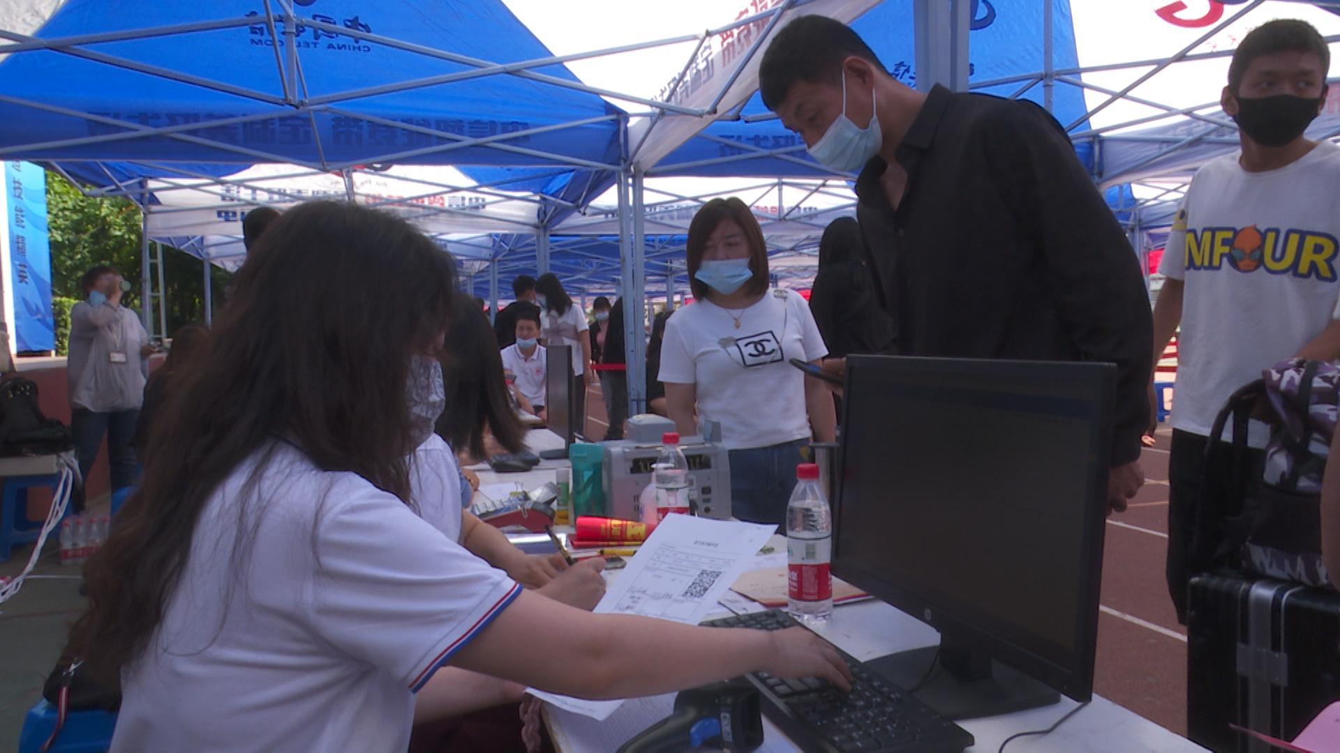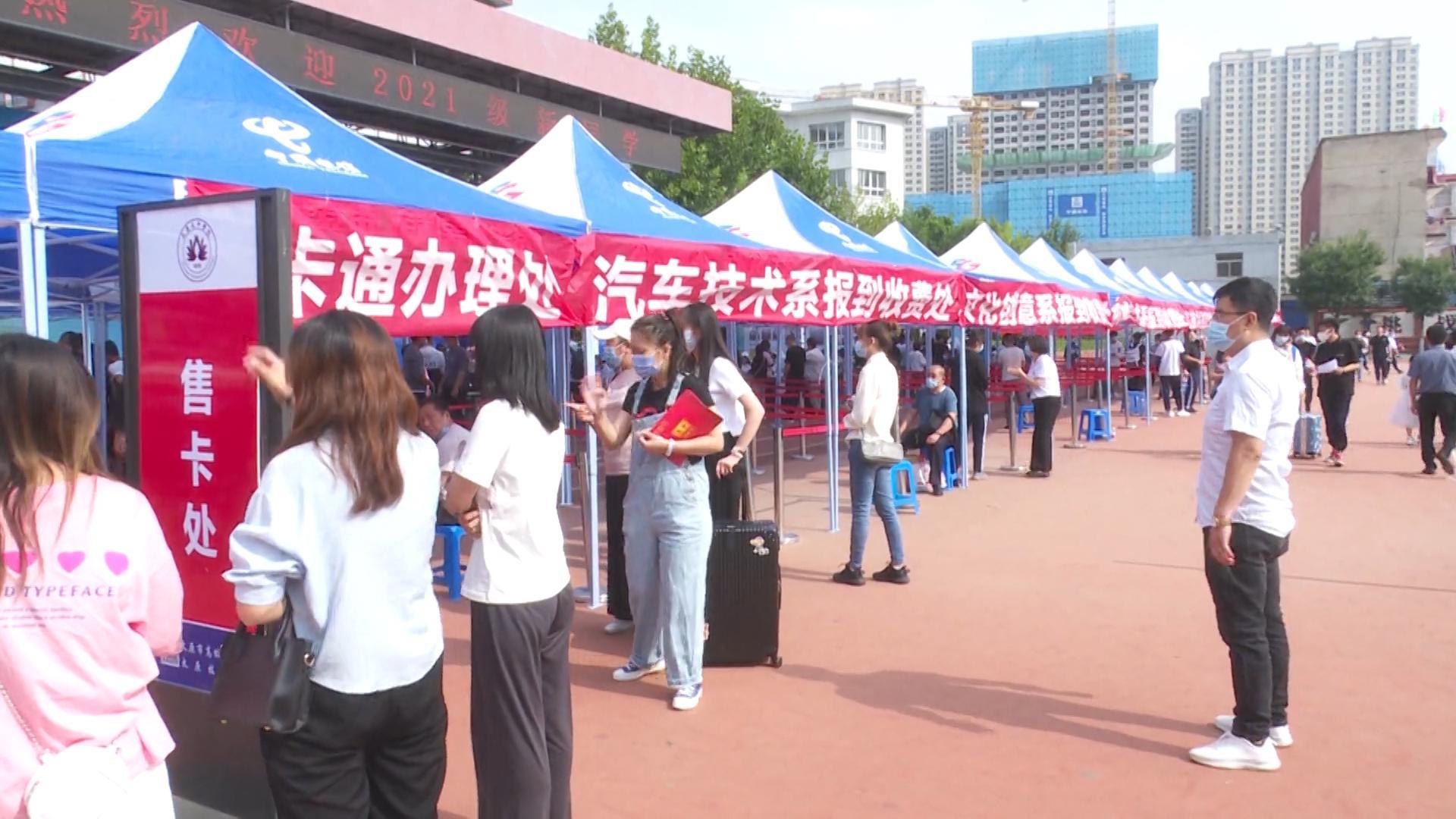 上午前来报到的学生正整齐有序的进入校门,门口设有专人负责消杀工作,为大家的健康和安全保驾护航。同时,学校增设的报到、缴费、宿舍安排工作窗口,全部集中在露天区域,方便新生快捷办理手续。