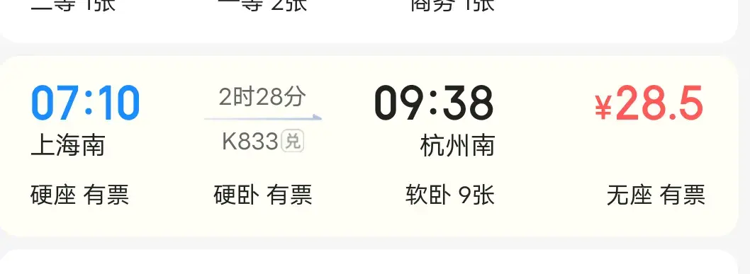 从上海南站坐7:10的K833,用28.5元的票价花时2小时38分到达杭州南站。
