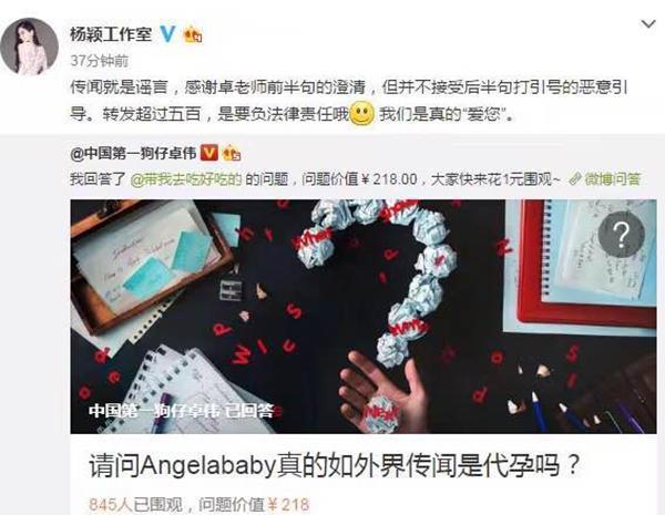 对于这事Angelababy 的工作室针对卓伟发布的内容进行了回应。Baby工作室转发称“传闻就是谣言,感谢卓老师前半句的澄清,但并不接受后半句打引号的恶意引导。”但还补充了一句:“转发超过五百,是要负法律责任哦,我们是真的‘爱您’。”