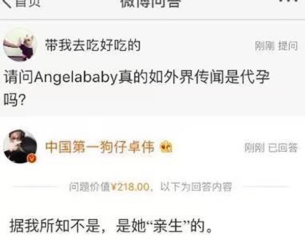 网络上有网友提问卓伟Angelababy的孩子是不是代孕的问题时,卓伟很明白地否认了这个传闻他回复:据我所知不是,是她“亲生”的。真是难得,难得中国第一狗仔卓伟为谁辟一次谣,但是卓伟显然不愿意直接这样将毫无悬念的清白还给baby和教主,于是便在亲生的两个字打上了引号。