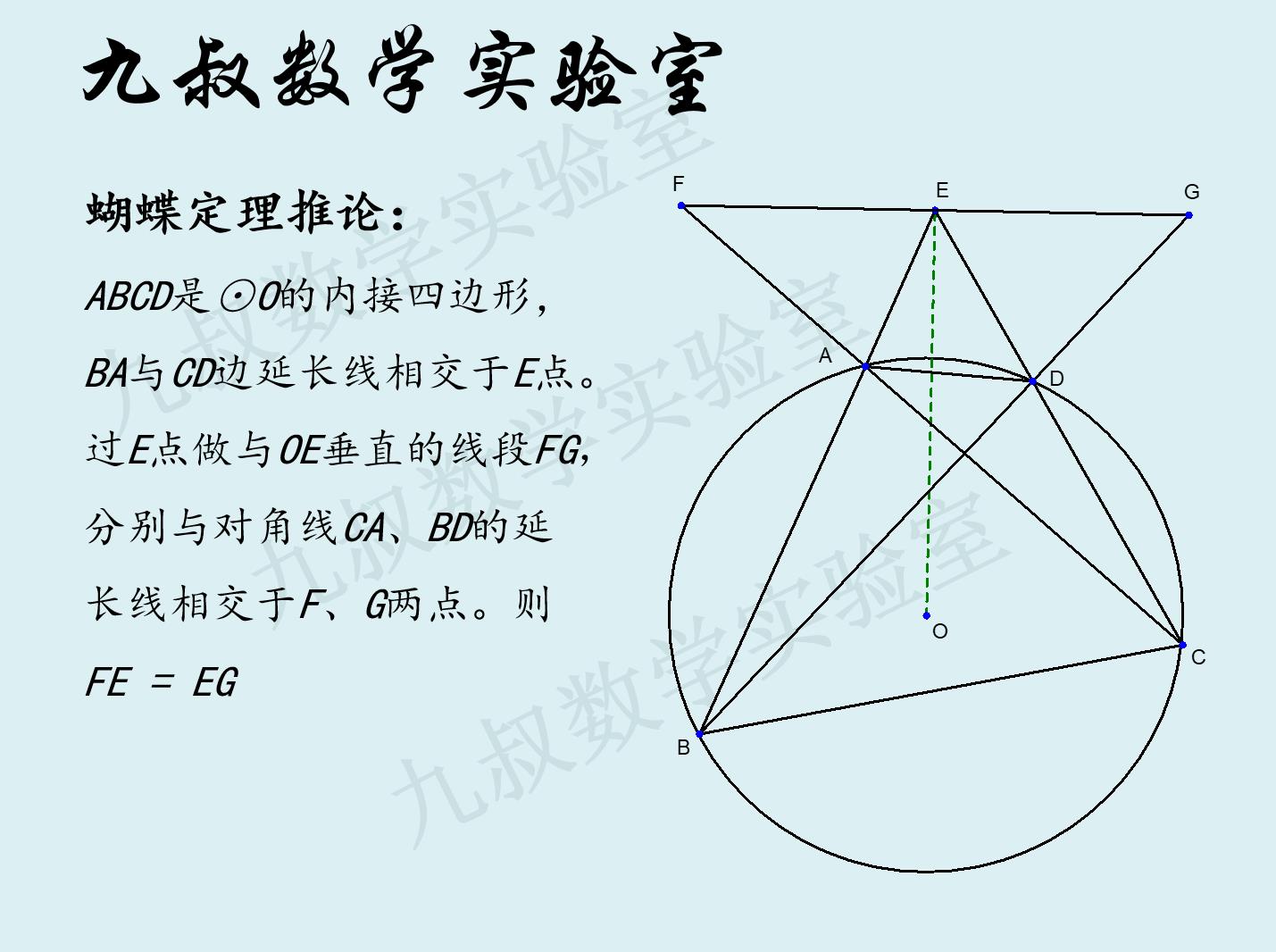在前天的文章中,我向大家介绍了蝴蝶定理和霍纳证明方法,并且提到当E点在圆外时,蝴蝶定理依然成立。有朋友提出问题:当E点在圆外时,应该如何证明呢?