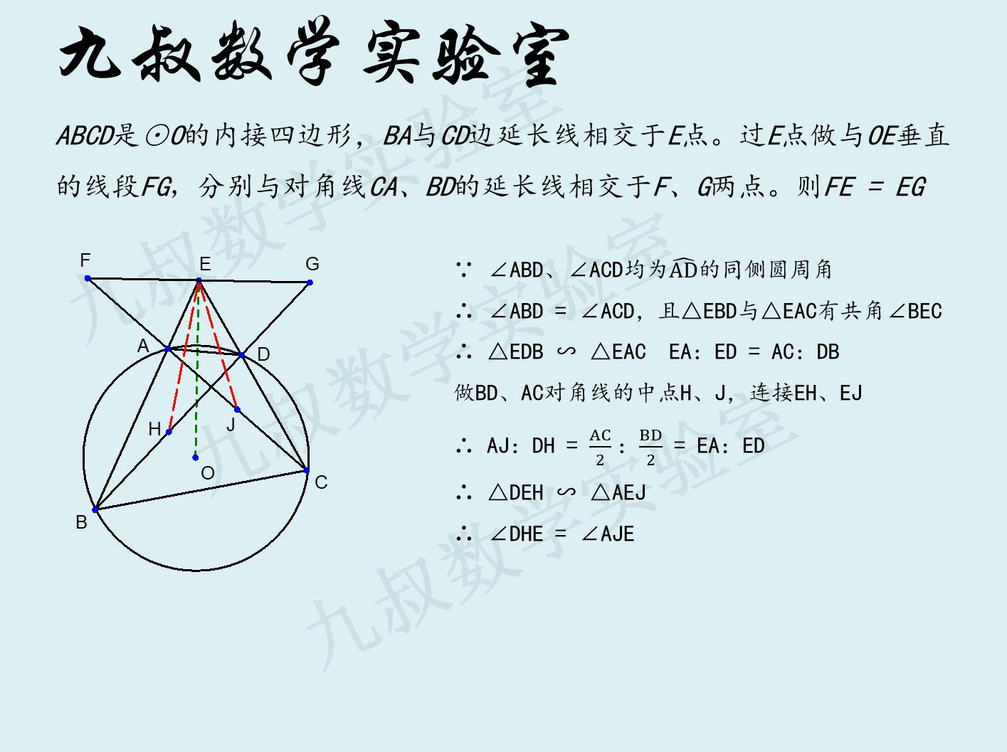 然后再利用共圆点的同弧圆周角来证明三角形△OFG为等腰三角形,从而证明FE = EG。图3是具体的证明过程:
