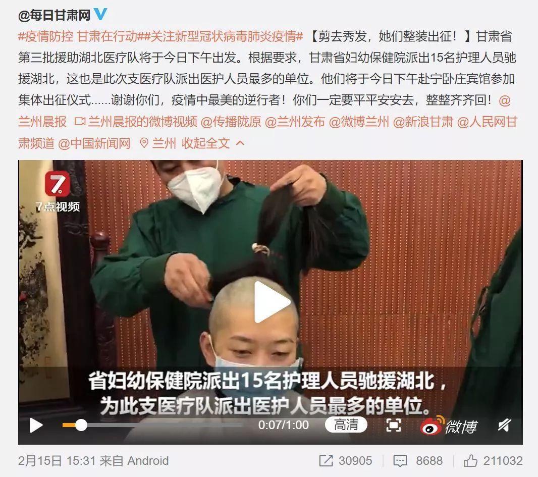 事情是这样的。2月15日,微博@每日甘肃网发布了一条标题叫【剪去秀发,她们整装出征】的宣传信息,配的视频是女性医护正在集体剃光头的画面。