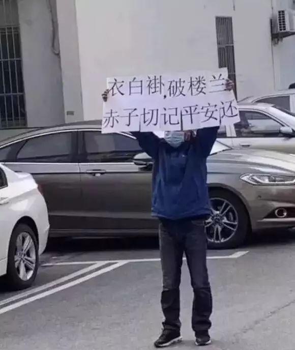 前段时间,还有这样一个新闻。有一位妻子赶往前线的时候,丈夫给她写了一句诗,专门举着牌子和她告别。这句诗是这么写的:衣白褂,破楼兰,赤子切记平安还!