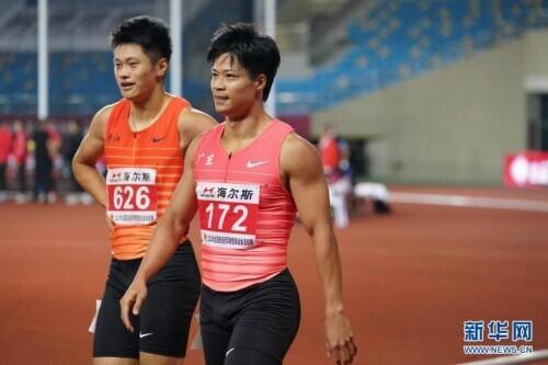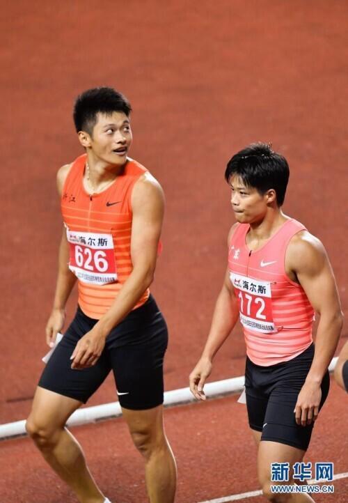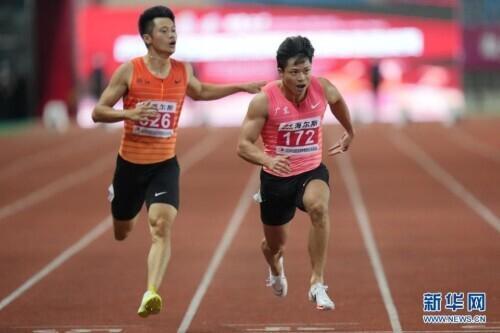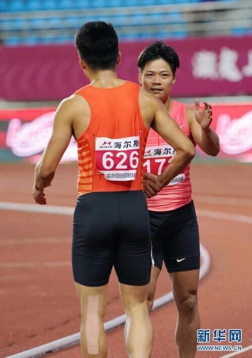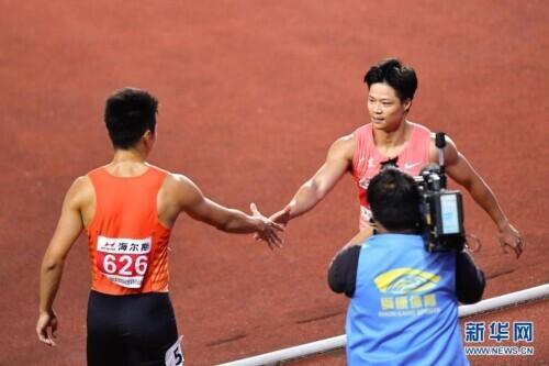 6月11日,广东队选手苏炳添(右)在比赛后接受浙江队选手谢震业的祝贺。