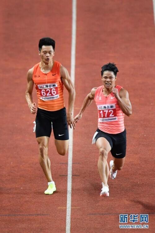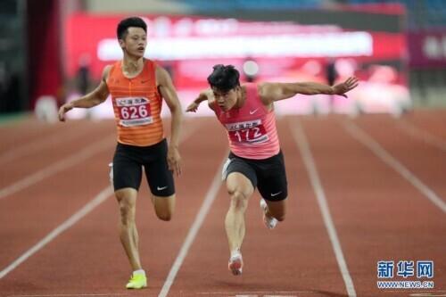 6月11日,广东队选手苏炳添(右)与浙江队选手谢震业在比赛中。