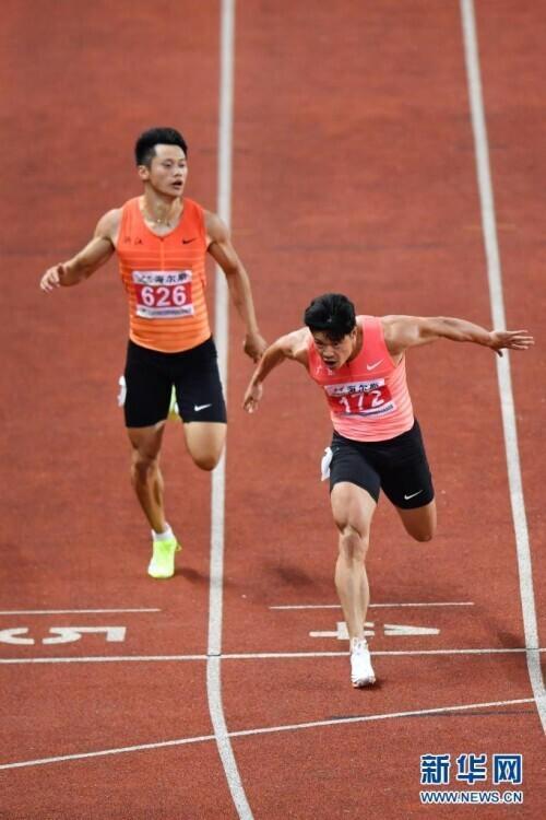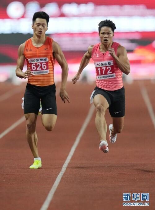 6月11日,广东队选手苏炳添(右)在比赛中冲过终点。