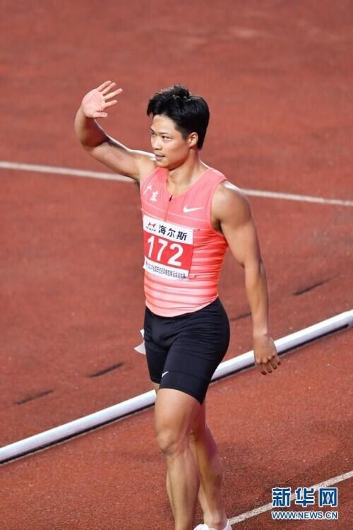 6月11日,广东队选手苏炳添在比赛后向观众致意。