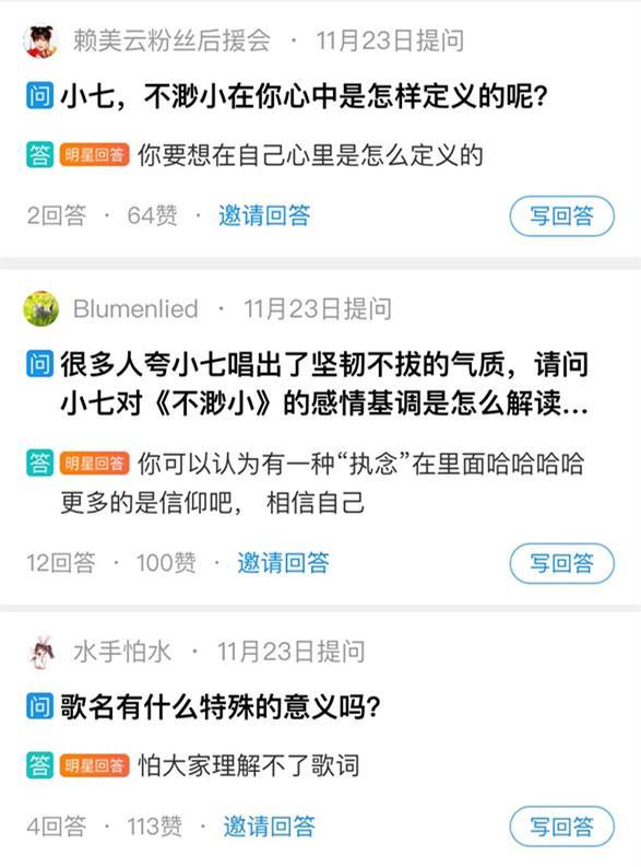 《不渺小》上线后,小七更亲自空降酷狗音乐评论区和歌手主页问答区,翻牌停不下来~对于“歌名有什么特殊意义”这一问题,小七坦言:怕大家理解不了歌词。好贴心的说~而面对“唱出了坚韧不拔的气质”彩虹Pi,小七解释,因为在演唱的时候融入了自己的“执念”和“信仰”!当然,在她看来,每个人对新歌都有不同的理解,要坚持自己心中的定义的“不渺小”!