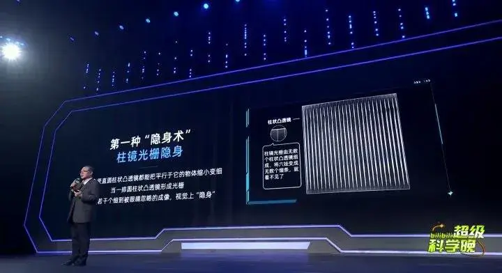 褚君浩院士展示的“隐身术”使用了一种名为柱镜光栅的特殊材料。这种材料由排列组成的微小圆柱状凸透镜构成,可以使光线按照一定规律折射,从而实现“隐身”效果。具体来说,平行入射的光线经过柱镜光栅折射后,会产生复数条重复的细图像。这些重复图像非常细小,在一定距离人眼无法分辨,从而达到隐藏背后物体的“隐身”效果。