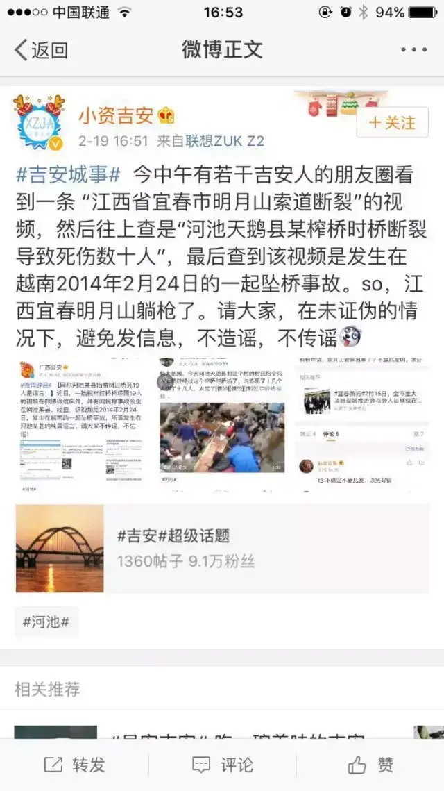 明月山管委会立即着手调查,证实明月山缆车、索道均运转正常,并未发生任何事故。网上调查该段视频谣传为“河池天峨县某窄桥断裂导致死伤”。最后查到该视频是发生在2014年越南的一起坠桥事件。请大家在未经证实的情况下,不信谣、不传谣。