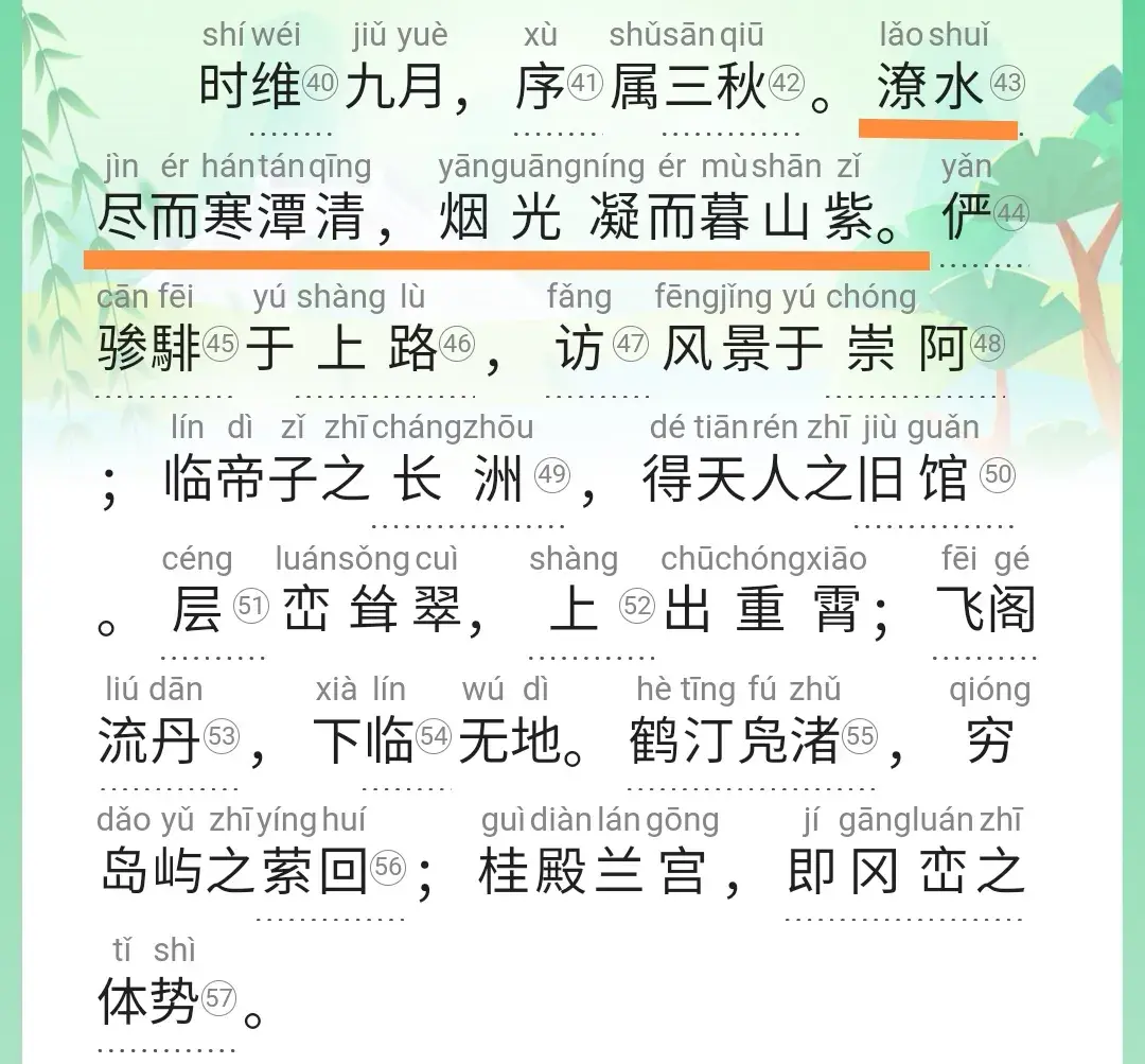 下一句就是潦水尽而寒潭清,烟光凝而暮山紫。这句的最后一个字是紫字,用紫组词,就是紫烟,然后用烟雾的烟谐音联想到俨骖騑于上路的俨。