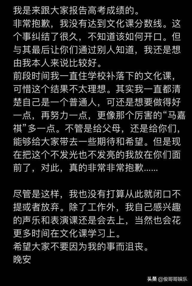 他为自己考得不好向粉丝道歉,言语间有失落和难过,但也表示会继续自己喜欢的声乐和表演课,也会花时间在文化课上,希望粉丝不要因为他考砸而沮丧。