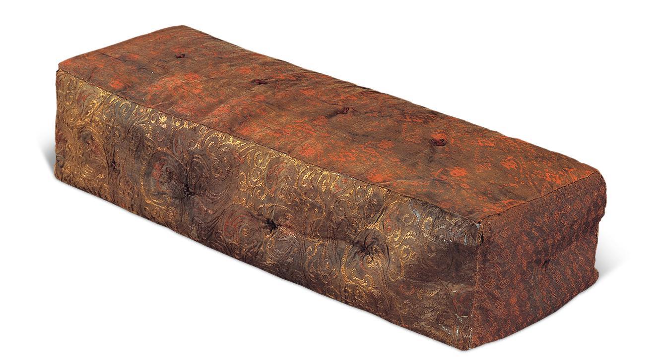 图5 长寿绣枕 枕顶为香色地红茱萸纹锦