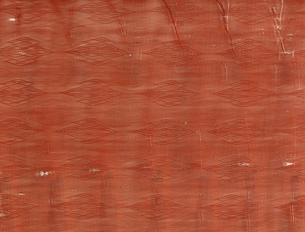 矿物染料是指将矿物研磨成细粒后制成染料,马王堆汉墓所使用的矿物染料主要是朱砂。朱砂又称“丹砂”,其化学成分为硫化汞,是炼汞的主要原料,质优者除供药用外,大多研磨成微细粉末作高级颜料,朱砂色呈大红色,并可按色泽分成若干等级。朱砂以产于辰州(今湖南沅陵一带)者最著名,故又称之为“辰砂”。马王堆汉墓出土的朱红色织物如朱色绢、朱色菱纹罗(图4)以及施绣所用的朱红色绣线、朱色印、绘等,都是用朱砂涂染或浸染而成。朱砂虽然颗粒大,但染得匀透,织物孔眼清晰,没有堵塞的现象。