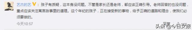 还有网友表示:孩子有质疑,这本身没问题。不管是家长还是老师,都应该正确引导。老师回答的也没问题,重点应该关注寓言故事里的道理。这个年纪的孩子,正在接受新的事物,给予正确的道路和理念,使我们必须要做的。