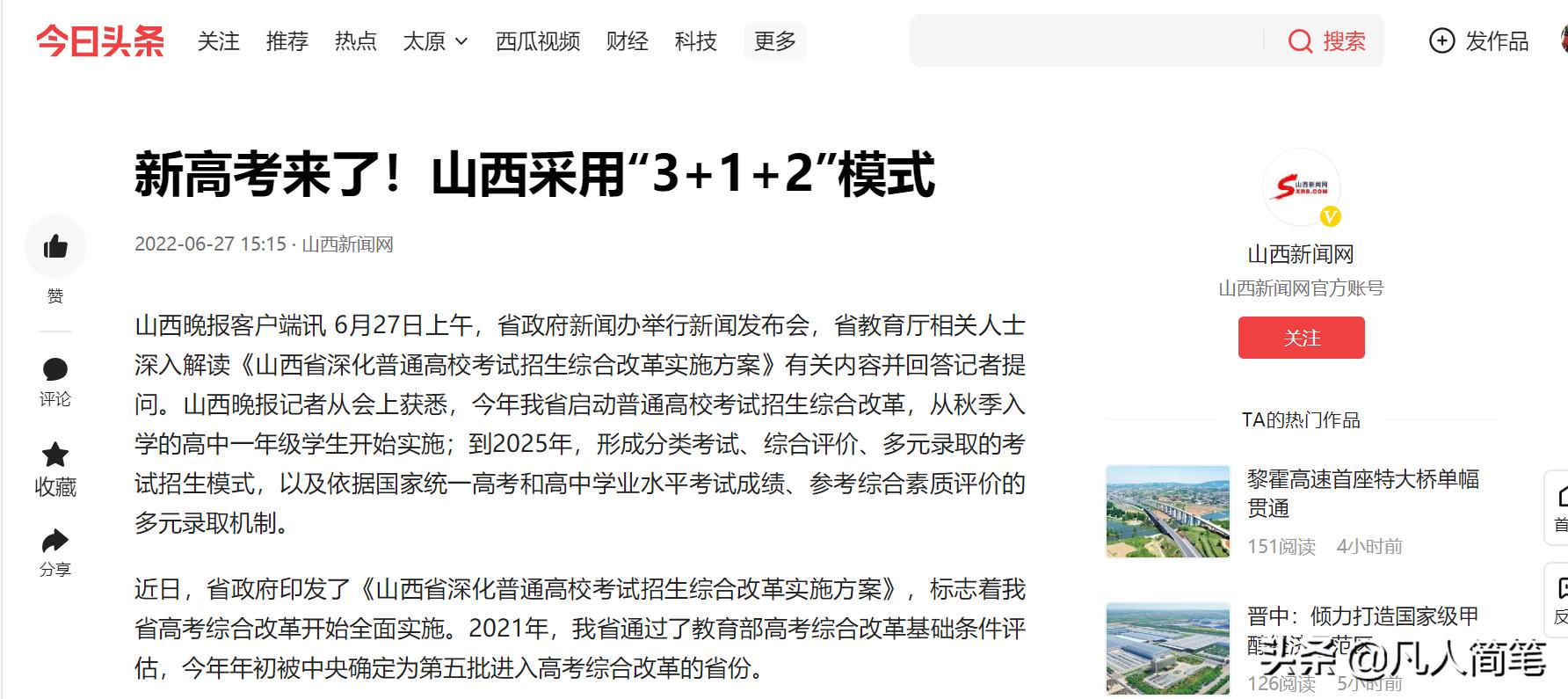 #山西头条##太原头条#6月27日上午,省政府新闻办举行新闻发布会,深入解读《山西省深化普通高校考试招生综合改革实施方案》有关内容。山西新高考改革正式拉开帷幕!具体内容可见山西新闻网《新高考来了!山西采用“3+1+2”模式》。