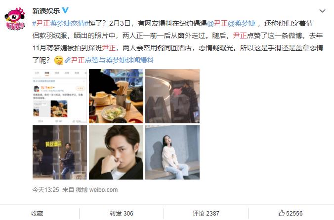 今天早上,有网友爆料在纽约偶遇尹正和蒋梦婕,两人穿着情侣羽绒服,虽然是一前一后的走,但是明眼人都可以看出两人是一对,而且在网友爆料不久,尹正还亲自点赞这条微博,这个举动也是让粉丝有稍许的迷茫,到底是故意点赞还是手滑。其实两人中间的路还是挺长的,去年的时候还曾被拍到探班尹正,两人亲密用餐同回酒店,再加上这次的情侣衫衣服,这个恋情基本是可以肯定了。