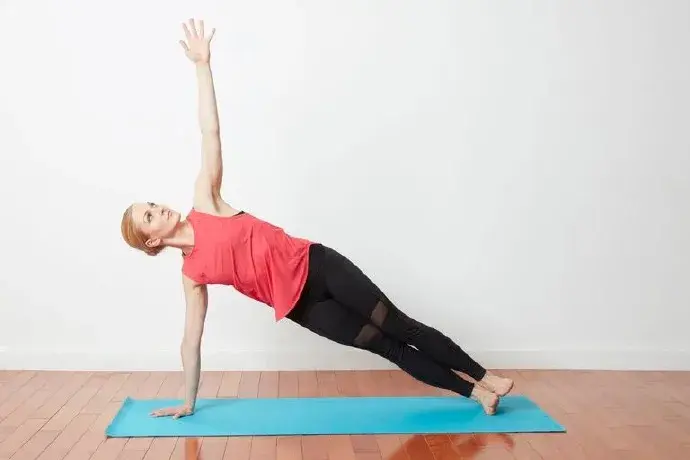 ●首先右手撑地,双腿伸直,用侧腰去发力,盆骨向上举,左手臂向上。