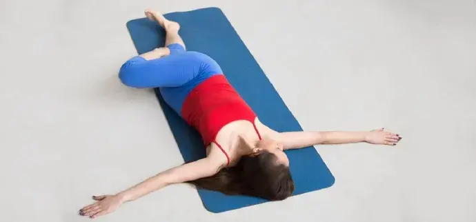 ●吸气,双膝左转,头右转。保持下背部的自然弯曲。充分伸展上半身。双肩紧贴地面,肩胛骨收拢。