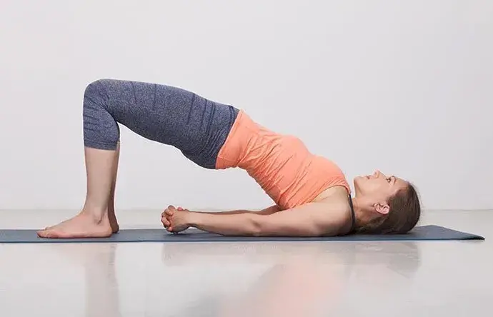 ●屈双腿并拢,双手合十放在臀部,慢慢抬腰腹部和臀部离地。