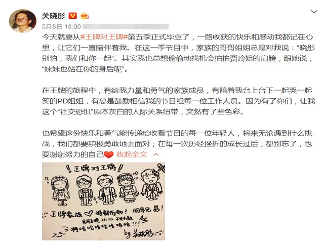 其实关晓彤在节目播出的前一天,就已经在自己的微博中给出了一些明示了,她感谢了王牌家族的成员和节目的工作人员,表示出这个节目给了她很多的成长,尤其是在人际交往这方面对她的帮助很大,最后也祝福了网友要乐观积极。